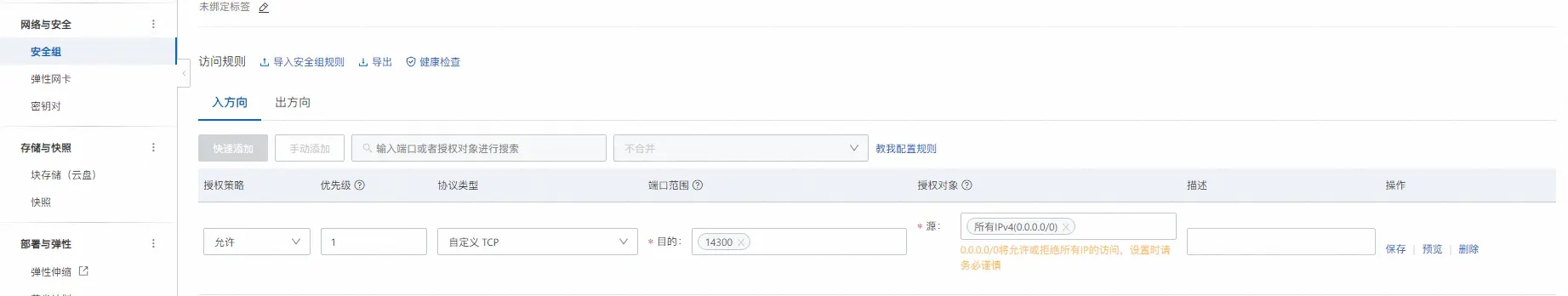 14300,源:选择所有IPv4(0.0.0.0/0),保存(入方向、出方向都要添加)